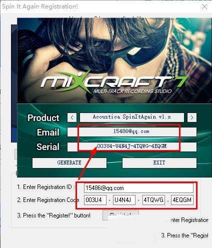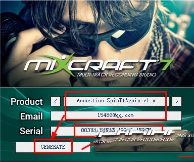5、运行Keygen-R2R文件夹里的Acoustica_KeyGen.exe,选择Acoustica Spin It Again,输入任意邮箱,点击generate