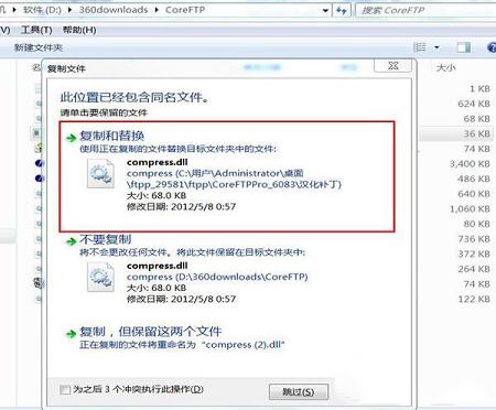 1、安装完成后先不要打开软件,首先打开软件包将汉化补丁中的所有文件复制到软件安装目录下替换原文件, 默认路径为“C:\Program Files (x86)\CoreFTP”。
