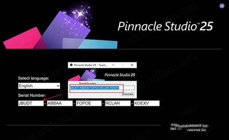 9、回到解压的数据包中运行安装程序“Pinnacle-Studio_25_Installer.exe”,在运行“Crack”中的注册机“keygen.exe”点击“generate”生成注册码,将其复制到安装程序中点击“next”
