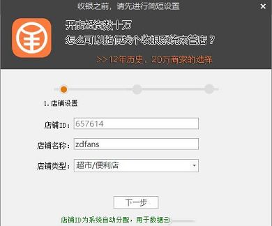 4、进入软件,需要设置你的店铺名称、店铺类型,电话号码、登录密码等,自行设置,点击下一步。
