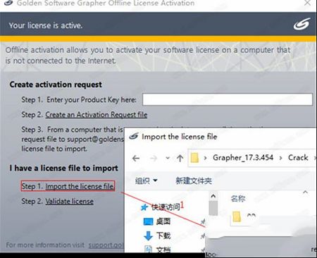 7、此时,在弹出的框内,点击Import the license file,选择crack夹中的grapher.lic的文件导入