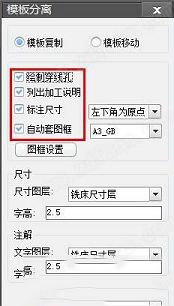 2、在软件中进行“自动拆图”的操作非常简便:设计师可以在“模板分离”对话框中直接选择分解图输出项“绘制穿线孔”“列出加工说明”“标注尺寸”“自动套图框”,然后选择“尺寸图层”“文字图层”等分别进行参数设置。选择总图后,各分解图即刻生成。