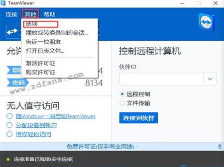 点击其他→选项,然后在随windows一同启动teamviewer前打勾,就可以设置固定密码啦!