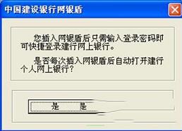 3、屏幕弹出快捷登录设置提示,如下图:如点击“是”,下次插入建行网银盾,将会自动打开建行网银登录界面;如点击“否”,下次不再弹出快捷登录设置