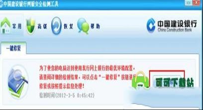 3、当您由于电脑设置和操作不当问题导致您不能正常使用网银时,您可以通过点击E路护航安全检测工具中的“一键修复”按键将您的电脑和浏览器配置到网银运行的最优环境。如下图所示