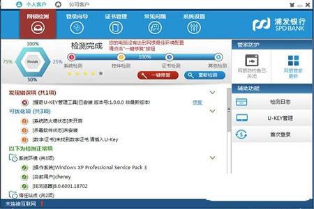 一、一键配置网银使用环境1)启动网银管家将自动进入系统检测,检测完成后,如未达到网银最佳使用环境,用户可点击“一键修复”进行修复,如图所示,一键修复完成后,按钮名称将变成“网银登录”,客户可以直接点击登录网银登录界面