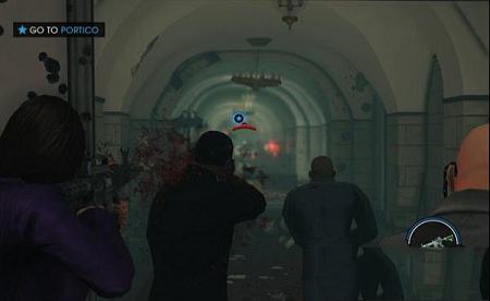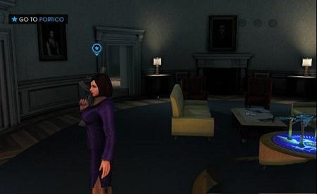 6、顺着蓝色标志一直走到办公室,转动华盛顿的头像,原来办公室是秘密军火库,周围架子能找到散弹枪,火箭筒,机枪等又粗又硬的玩意。