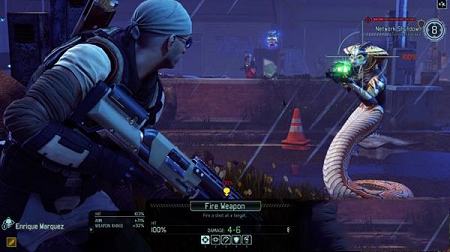 玩家可以选择潜行状态,这样敌人不会发现,地面上红色眼睛标示区域为暴露区域。潜行状态不能进入红色标示区域。潜行状态的攻击会有伏击效果。命中伤害都有加成。伏击后暴露目标,进行遭遇战。接着是攻击,攻击也会消耗一个行动点。点击攻击,选择目标,可以看到命中、伤害和暴击预估。