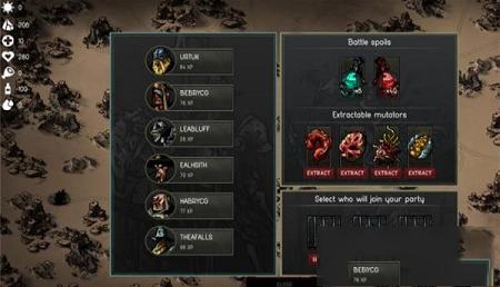 5、配合各种属性不同的突变品和技能点的分配打造出另自己满意的强力角色吧。(角色两次死亡即永远死亡,队伍人数不满时游戏失败)。