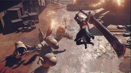 5、游戏里面充斥着各种暴力元素,这非常符合日系游戏的特点。女主角孤身一人,蒙着眼睛,与各种各样的机器人搏斗。