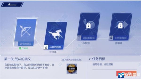 关卡分为四关,分别为:战斗的奥义、马背的疾风、追踪的智慧、日蚀的威胁。每关首次通关可获得100星币,共400星币