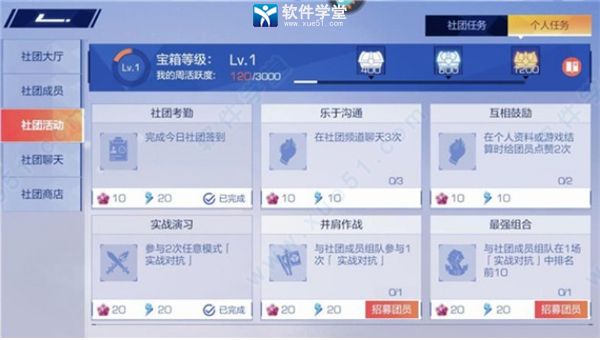 加入社团的小伙伴们可以通过每周的社团活动赚取社团活跃度打开社团宝箱,社团宝箱中存有黑玉和社团币。