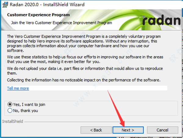 11、勾选“No,thak you”,这里类似于一个“参加程序优化”活动,它会自动将相应的使用信息直接发送到该公司的某个账号上,有泄露某些内容的威胁,所以建议选择NO,并点击Next。