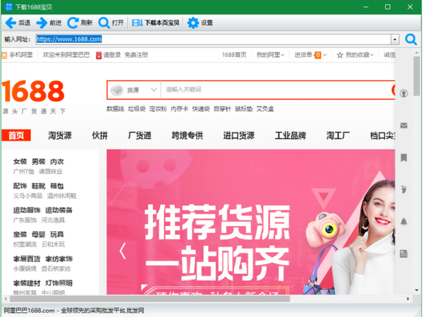 第一步:以1688为例,点击左上角“下载1688宝贝”按钮,弹出窗口中会自动打开1688的首页,如图所示: