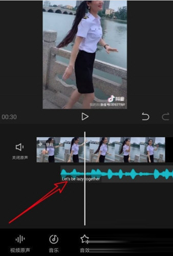 2、进入到视频编辑界面之后,我们点击选中视频素材,这时候即可在下方出现一个功能列表,在列表中选择“音乐”。