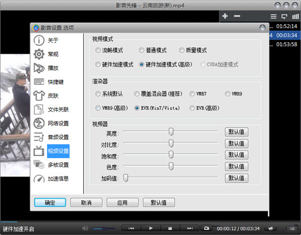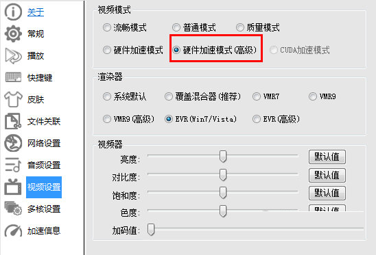 首先进入播放器的影音设置选项,在【视频设置】中,将视频模式中选择【硬件加速模式(高级)】,同时渲染器设置为系统默认,之后重启播放器后再次尝试播放。