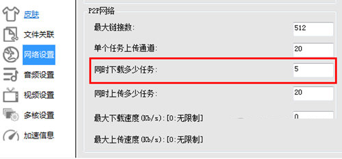同样的在播放器上右键,选择影音设置属性,在【网络设置】中设置【同时下载多少任务】即可,默认为5个。说明能够同时最多下载5个任务。