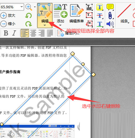 若是其他格式的添加的水印再转成PDF文件的这种水印,点击编辑按钮选中水印右击删除即可。(图片中以背景存在的水印是无法删除的哦)。