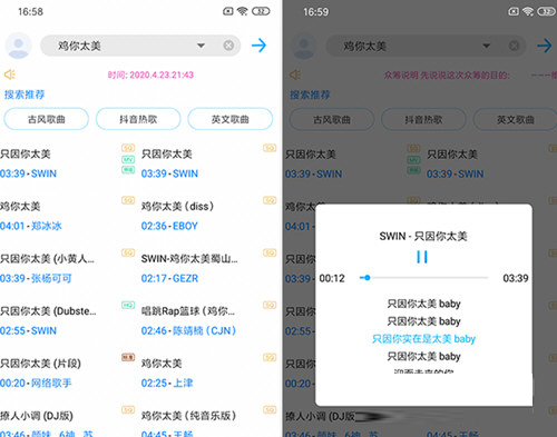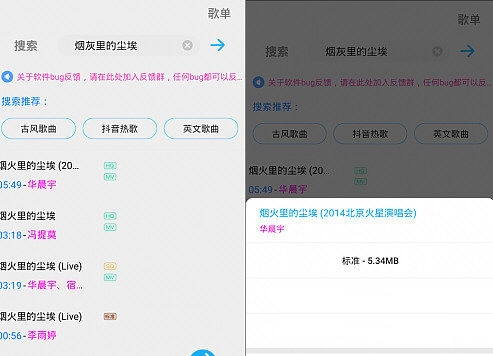 4、可以进行歌词或者关键字以及歌手等进行一键搜索。