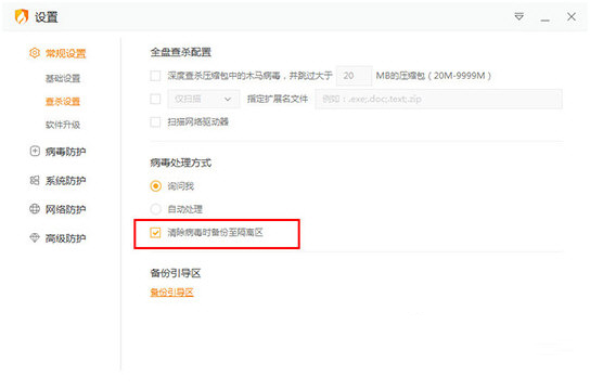 1、针对广大用户对隔离区存在疑问,小编就来说说关于隔离区的各个内容,首先需要先进入到火绒安全软件内,如果你想要设置将程序放置到隔离区时的提示,只需进入到设置界面,在查杀设置、病毒防护栏进行设置,你可以选择病毒的提示处理方式,也可以设置是否在清除或发现病毒将其备份到隔离区;如果不勾选此选项,系统在处理某些程序时,可能会造成数据丢失的情况,如下图所示: