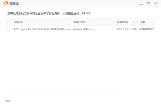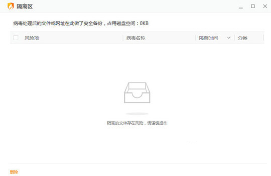 6、如果你想要清空隔离区内的文件,只需选中想要删除的风险项,点击左下角的“删除”选项即可进行删除,如下图所示: