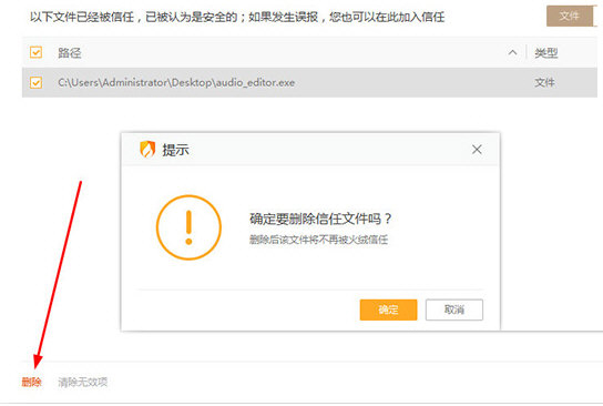 4、小编随意添加了一个文件,如果你想要删除此信任文件,只需的点击左下角的“删除”功能进行删除即可,删除后的文件将不再被火绒所信任,如下图所示: