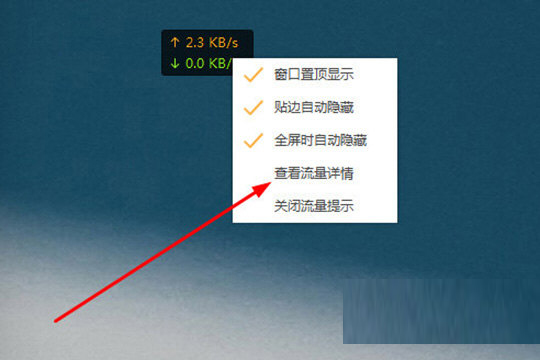 3、你还可以对此悬浮窗进行设置,根据自己的需要选择是否开启窗口置顶显示、贴边自动隐藏或全屏时自动隐藏功能,如果你想要查看具体的流量,只需点击“查看流量详情”选项即可进行查看,如下图所示: