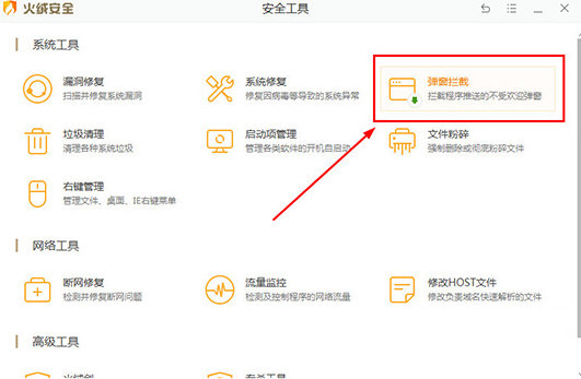 2、进入安全工具的界面内,在系统工具中点击“弹窗拦截”功能,此拦截程序就是今天所说的主角,它可以帮助用户拦截推送不受欢迎的弹窗,如下图所示: