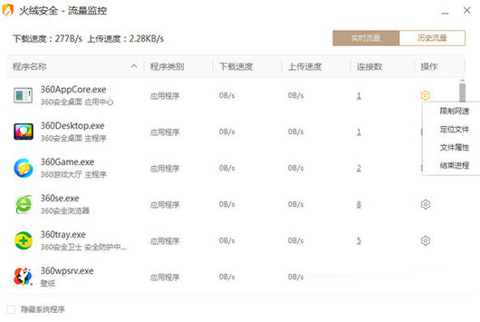 4、弹出流量监控的窗口界面,你可以在窗口中看到当前每个程序的上传速度与下载速度,如果你想要限制此软件的网速,只需选择点击操作下的“限制网速”选项即可开始操作,如下图所示: