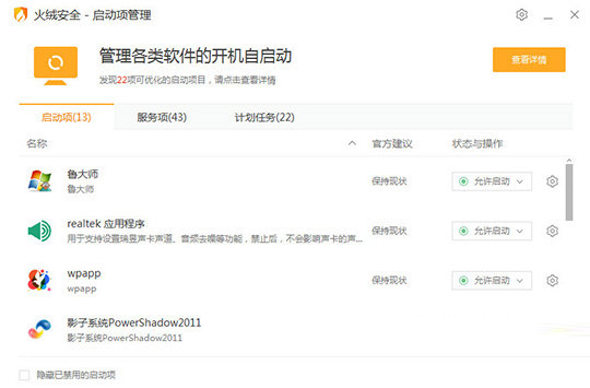 3、在启动项管理功能中,用户可以在其中看到启动项、服务项与计划任务三个栏目,大多数情况下只需要更改启动项栏目中的程序即可,你可以在每个拥有自启动项的程序中看到火绒给出的官方建议,如下图所示: