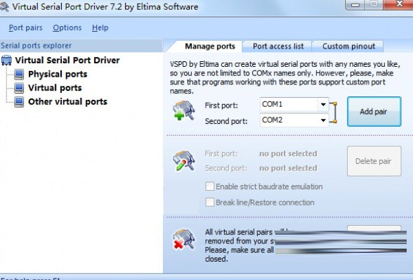 虚拟串口软件是可以在系统中创建更多的串行端口,一款非常专业的虚拟串口软件。虚拟串口工具功能十分强大。并且能够对硬件模拟器和应用顺序进行测试,该版本为软件最新的7.2版本,并且内置破解补丁,虚拟串口软件用户可轻松进行激活破解,可进行永久免费使用。