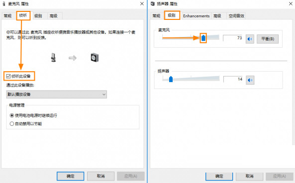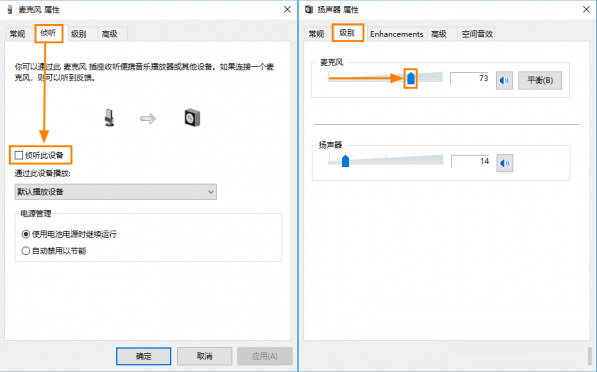 3)弹出 窗口,在 “侦听” 菜单中取消选中 “侦听此设备” 选项,并在 “级别” 菜单中麦克风音量设置为70%〜90%左右。如图