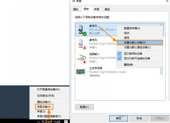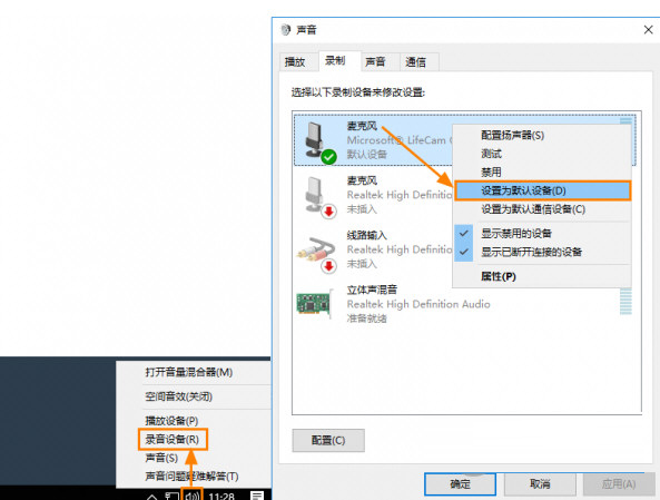 2)请右击 window 主界面右下方的 “声音” 图标,选择 “录制设备” 选项,选择 “麦克风” 右击设置为 “设置为默认设备”,然后点击 “属性”。