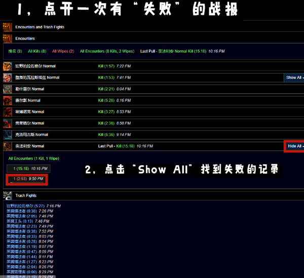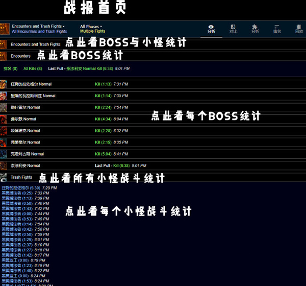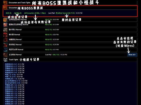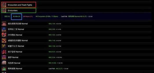 Encounters and Trash Fights ——所有BOSS遭遇战与小怪战斗摘要页面