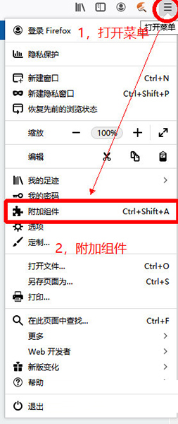 2、点击右上角的打开菜单,然后选择附加组件
