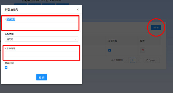 选择“新增”重定向,在“匹配模式”和“目标地址”分别输入