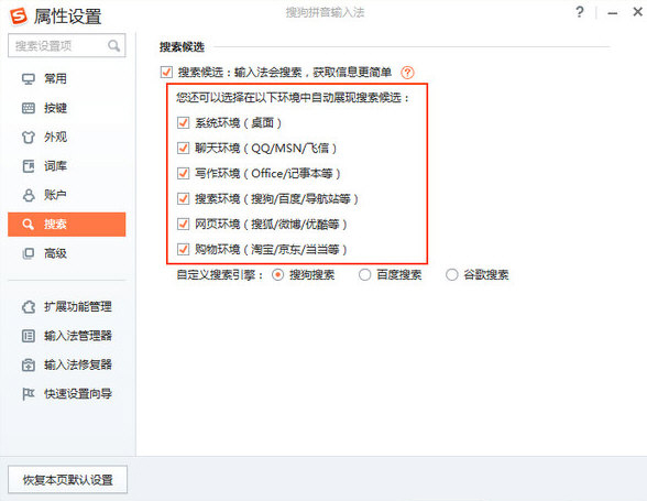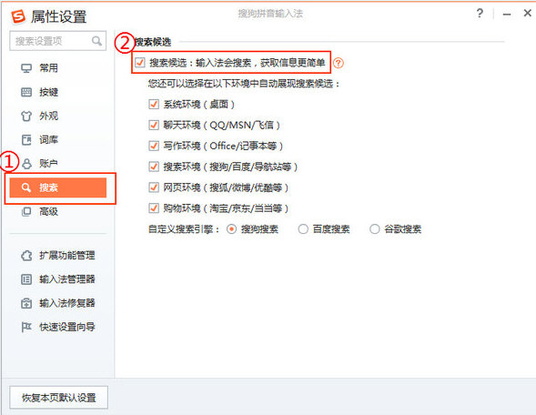 操作如下:打开输入法菜单-->属性设置-->搜索。 选择开启或关闭“搜索候选”即可。如果您取消了搜索候选功能勾选,输入法界面上将不再展现搜索候选下拉按钮,也将不响应↓方向键打开搜索候选结果。
