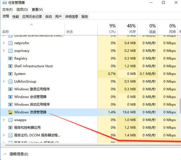 2、选中“Windows资源管理器”进程,点击右下角的“重新启动”即可重启Windows资源管理器,会发现桌面图标和任务栏会短暂的消失然后又重新显示,这就是Windows资源管理器进程explorer.exe结束后又重新开启的过程。