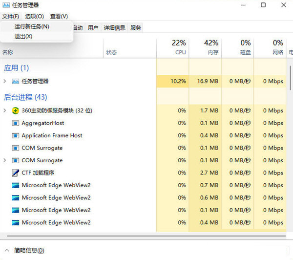3、按“Ctrl+Shift+Esc”组合快捷键打开“任务管理器”窗口,点击“文件”菜单,选择“运行新任务”。