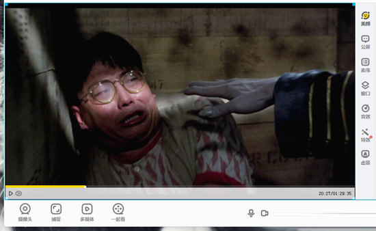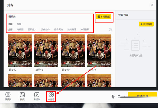 2、进入到娱乐直播的界面中,直接点击下方的“一起看”功能选项,接着将会弹出可播放的视频库,根据自己的需要选择影视类型,当然你也可以点击“本地视频”播放除视频库之外的视频,如下图所示: