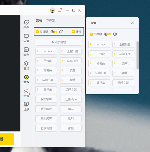 2、根据自己的需要选择是否开启“快捷键”与“挂件”功能,用户只需要点击键盘右边小键盘上的快捷键即可轻松播放音效,而挂件可以帮助用户无需调出YY开播工具,只需轻轻一点即可挂件上的音效即可播放音效,这两个功能都是非常不错的,如下图所示: