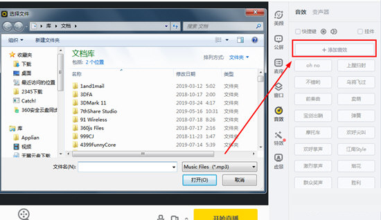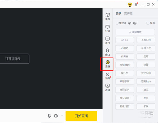 1、如果你想要为你的直播间增添趣味性,那么音效将是必不可少的,首先需要先进入到“娱乐直播”中,接着在右边的功能栏中选择“音效”功能,将会出现可点击的音效类型,如下图所示: