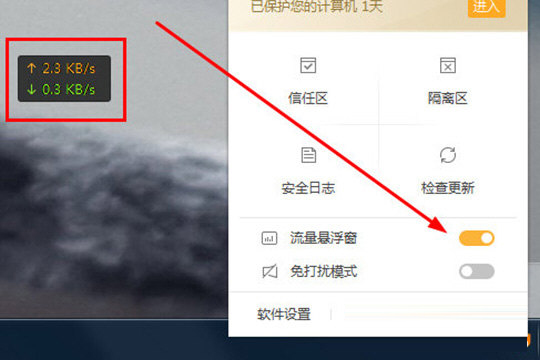 2、第二种开启悬浮窗的方法更为简单,你可以右键点击此火绒软件的图标,将“流量悬浮窗”进行勾选即可,用户可以在桌面看到刚刚出现的悬浮窗,向上箭头代表当前的上传速度,向下箭头代表当前的下载速度,如下图所示: