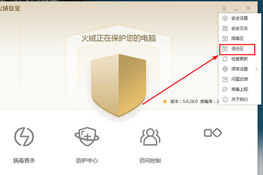 1、首先需要先进入到火绒安全软件内,如果你想要添加信任文件,只需要点击右上角的“菜单”选项,选择其中的“信任区”功能开始添加,小编了解到很多用户在使用时出现了文件被误删的情况,如果你想要找回之前被删除的文件,这时候只需点击“隔离区”选项,在其中进行恢复即可,之后再进入到信任区添加信任此文件即可,如下图所示: