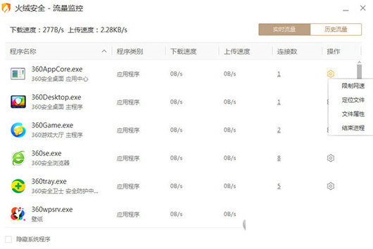 4、弹出流量监控的窗口界面,你可以在窗口中看到当前每个程序的上传速度与下载速度,如果你想要限制此软件的网速,只需选择点击操作下的“限制网速”选项即可开始操作,如下图所示: