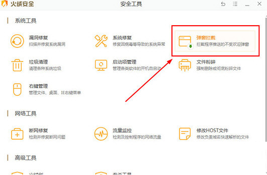 2、进入安全工具的界面内,在系统工具中点击“弹窗拦截”功能,此拦截程序就是今天所说的主角,它可以帮助用户拦截推送不受欢迎的弹窗,如下图所示:
