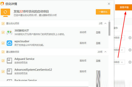 4、点击“查看详情”选项,你可以在优化详情中观看到建议优化项目与建议删除项目,只需点击一键优化选项,即可一键关闭各类不需要的启动项,如下图所示: