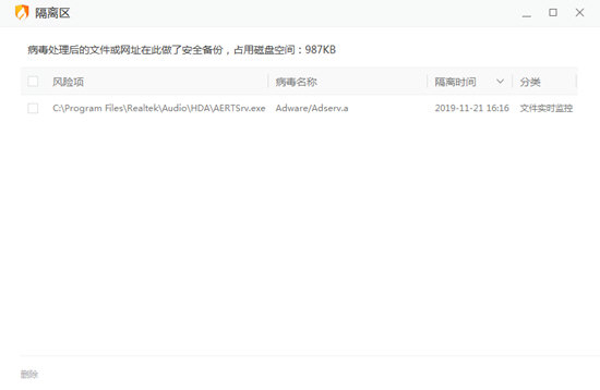 6、如果你想要清空隔离区内的文件,只需选中想要删除的风险项,点击左下角的“删除”选项即可进行删除,如下图所示: