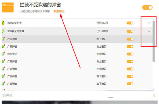 4、如果你想要查看每个拦截程序下具体的弹窗内容,只需点击项目类型中红框标注内的选项即可查看,除了软件默认拦截的几款程序,你还可以点击其中的“截图拦截”进行添加,如下图所示: