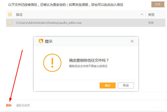 4、小编随意添加了一个文件,如果你想要删除此信任文件,只需的点击左下角的“删除”功能进行删除即可,删除后的文件将不再被火绒所信任,如下图所示: